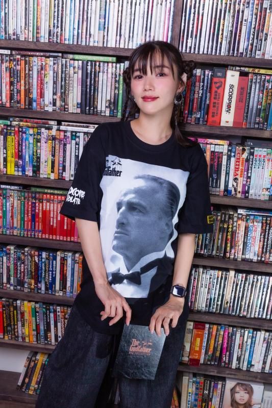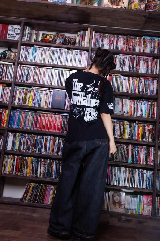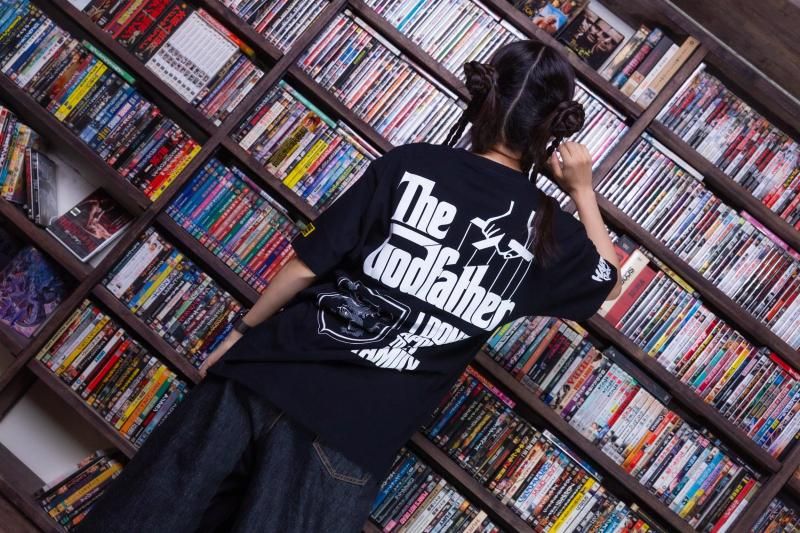 フロントにはドン・コルレオーネが重厚に鎮座し、バックプリントではロゴと家紋、そして名言が。